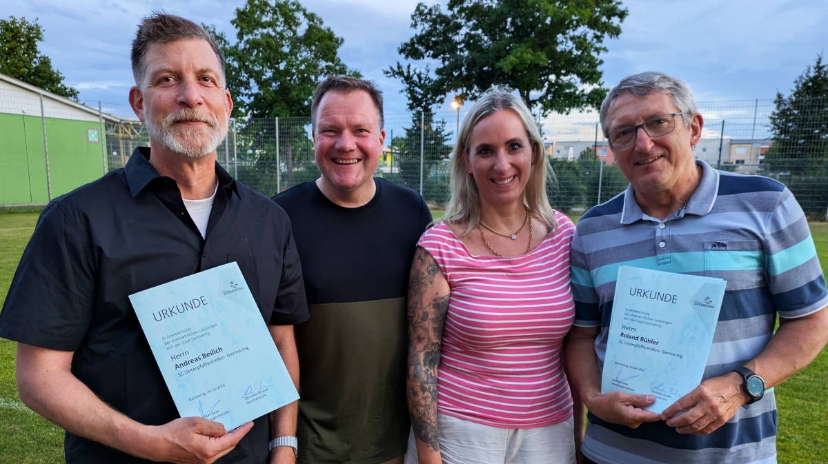 Andy Beilich (links) und Roland Bühler (rechts), erhielten gestern bei der Sportlerehrung der Stadt ein Geschenk mit Urkunde. Mitte: Sportreferent Christian Gruber und SCU-Vizepräsidentin Anne Wild